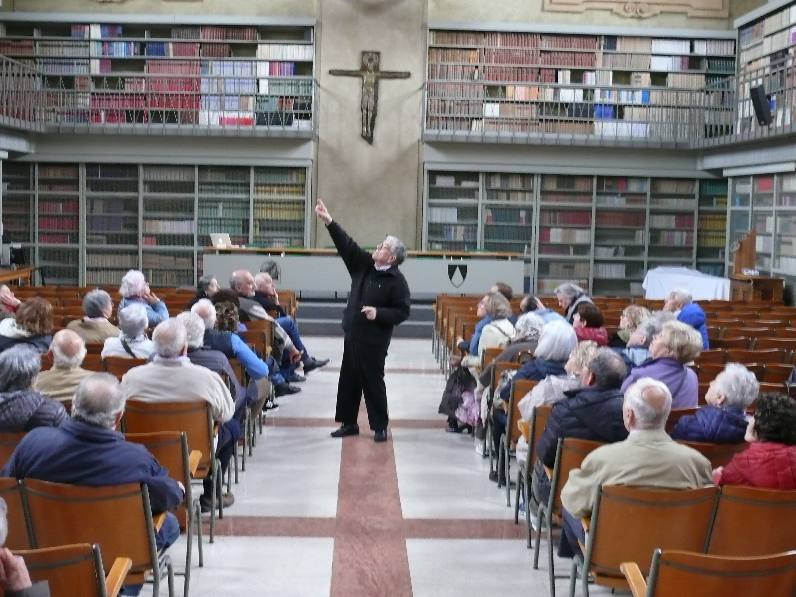 «Nel 1982 – ha raccontato Padre Angelo Piagno, sottopriore, bibliotecario e archivista del complesso di San Domenico – qui è venuto Papa Giovanni Paolo II per incontrare l’università di Bologna e per sviluppare numerosi temi con tanti cardinali. La biblioteca è aperta al pubblico. Con Napoleone la biblioteca era stata ridotta ad una caserma e i libri ammassati in varie zone del convento. E anche una volta andato via Napoleone, tutto il complesso di San Domenico era rimasto occupato da soldati e civili per decenni, mentre i libri erano finiti all’Archiginnasio. Per poter sistemare i frati avevano fatto delle celle nella sala della biblioteca che venne ripristinata all’originale tra il 1958-59. In una mezza vela c’è ancora il colore originale».