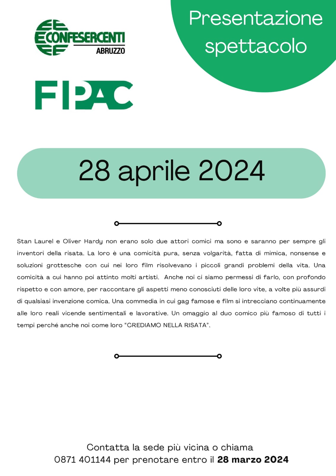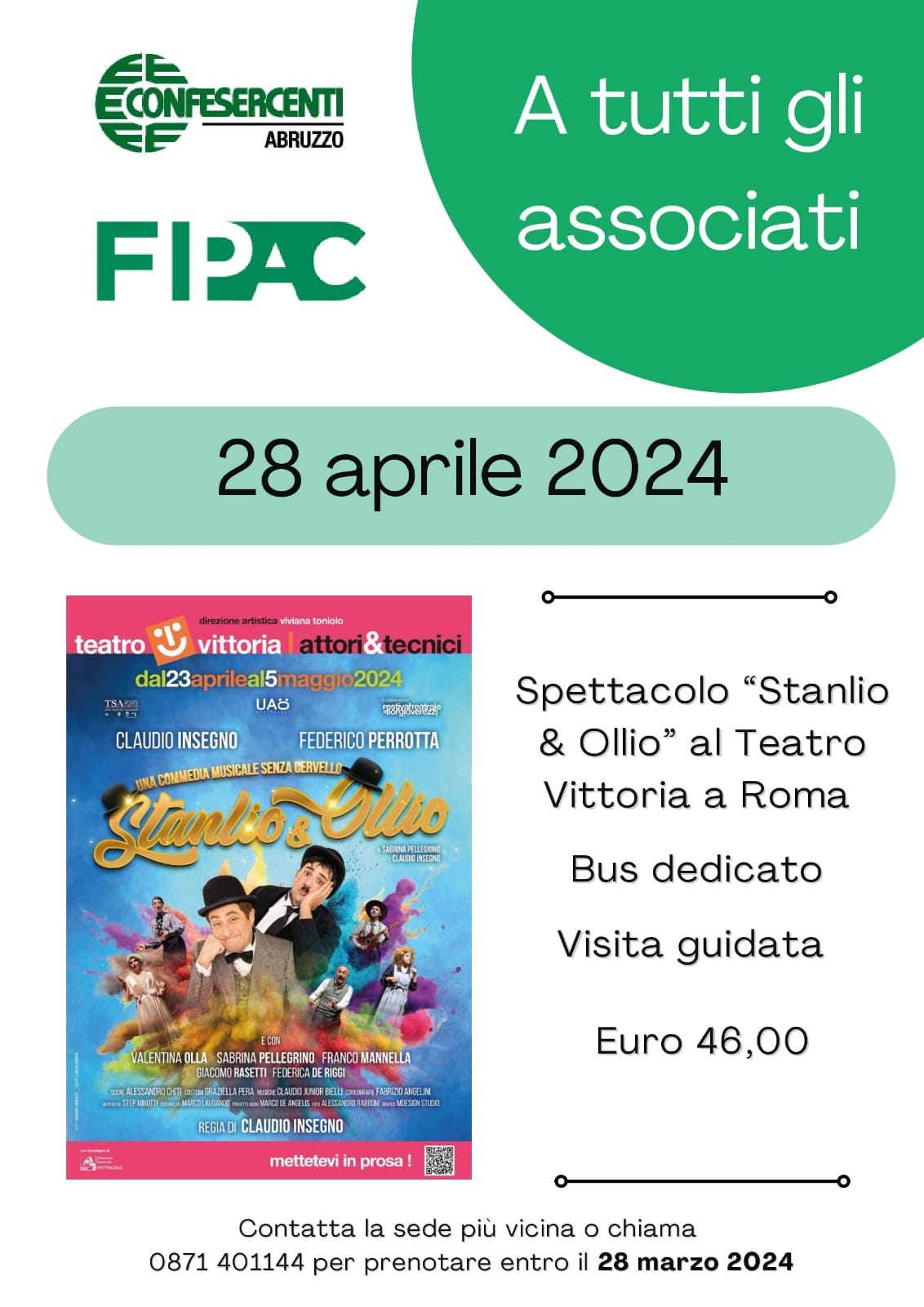 Domenica 28 Aprile la Fipac Confesercenti Abruzzo ha organizzato una gita a Roma, per andare a vedere lo spettacolo “Stanlio & Ollio”, al teatro Vittoria, con Claudio Insegno e Federico Perrotta, per la regia di Claudio Insegno.
