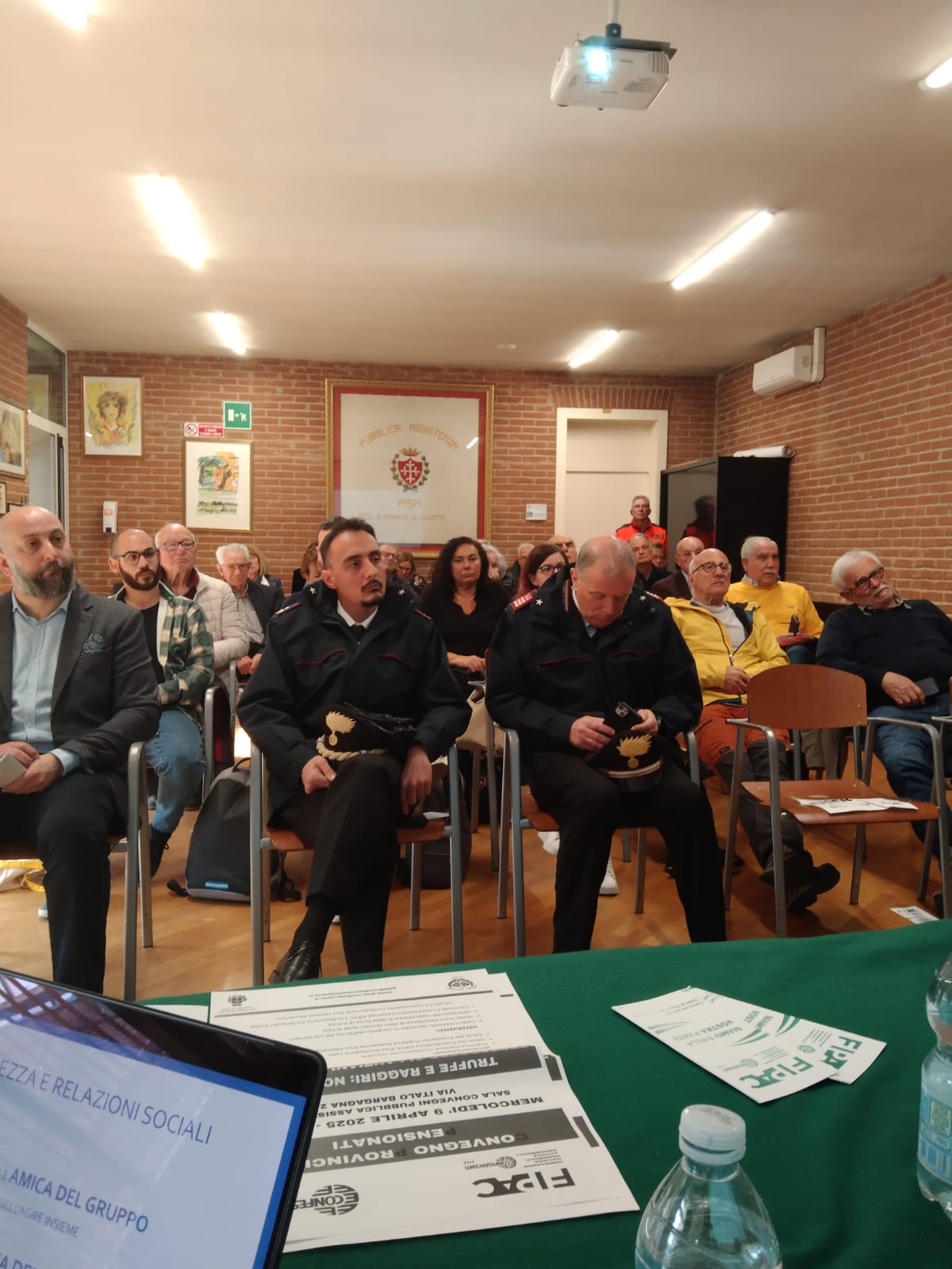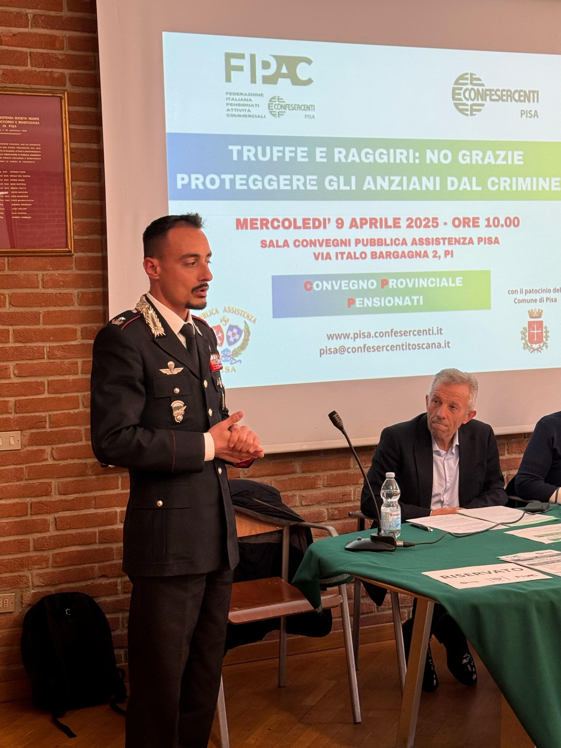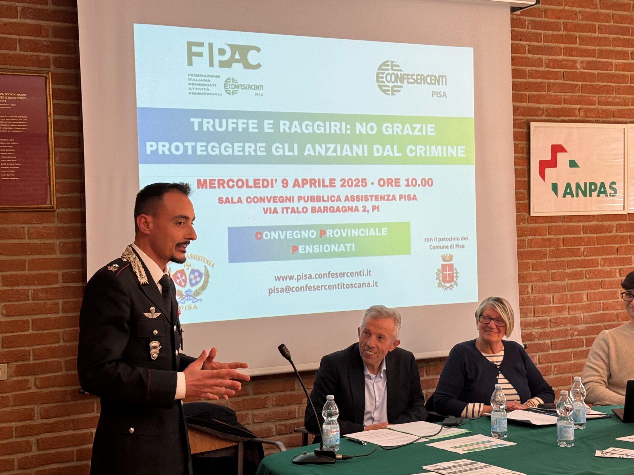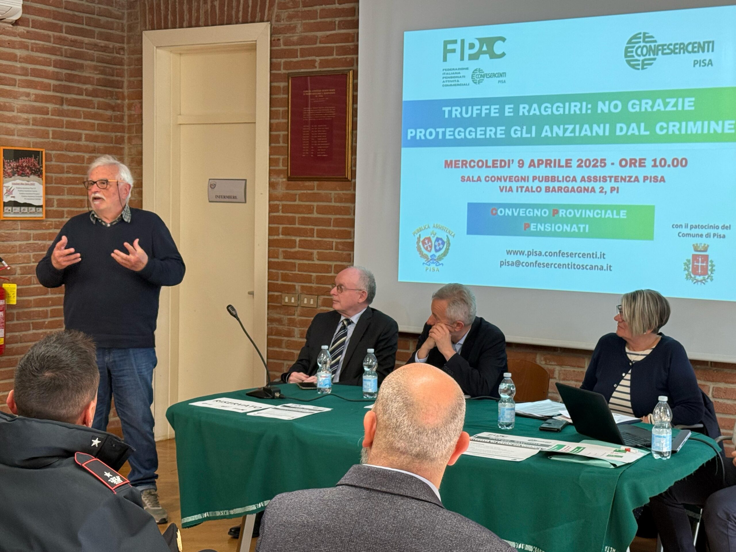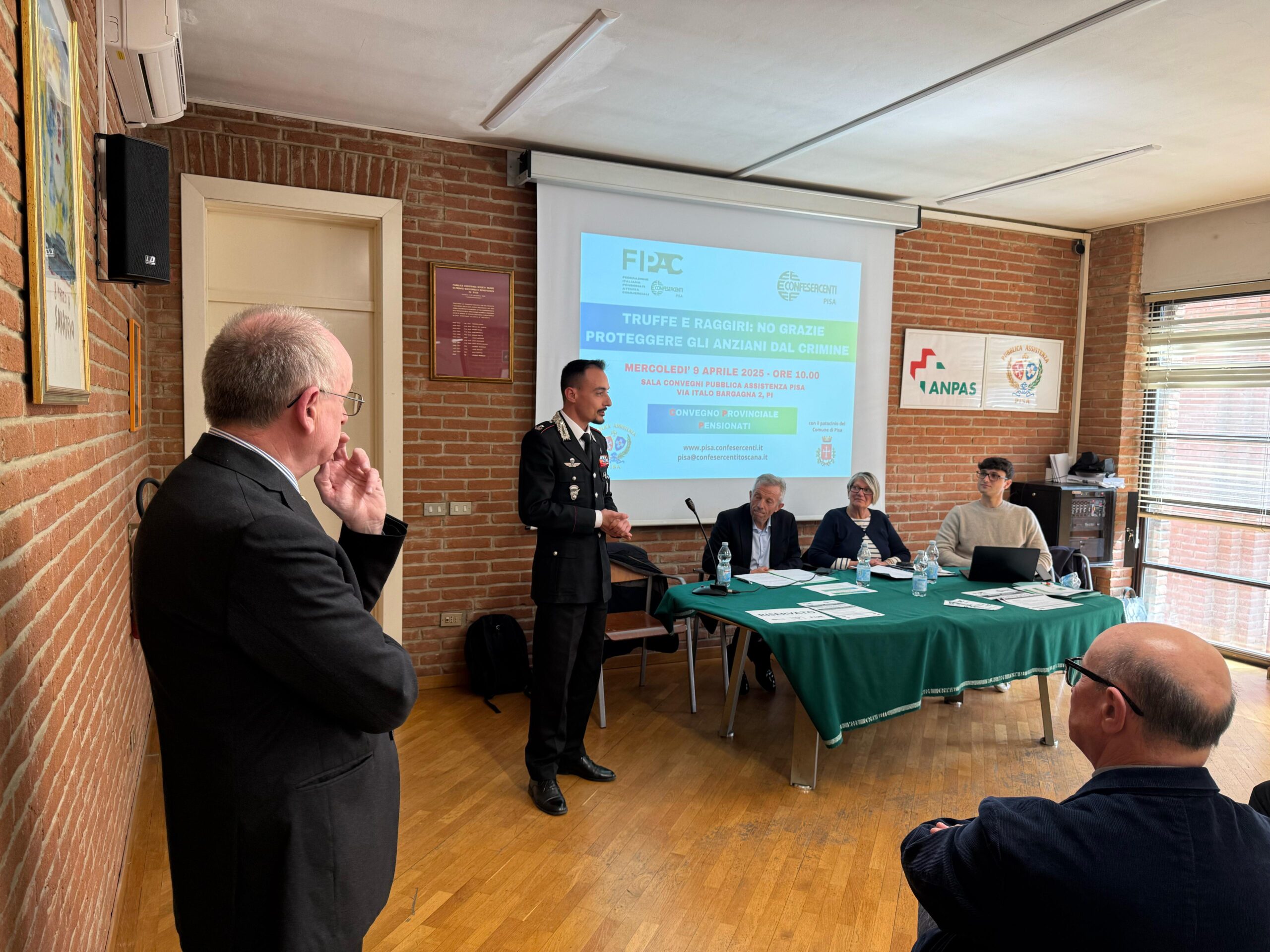 Tra gli interventi degli esperti quello del Maggiore dei Carabinieri De Lucera, il Generale Carlo Corbinelli, e Daniele Messa che ha parlato del progetto “Punto Digitale Facile” di ARCI Servizio Civile, con il quale Fipac Pisa collaborerà per digitalizzare i soci e pensionati.