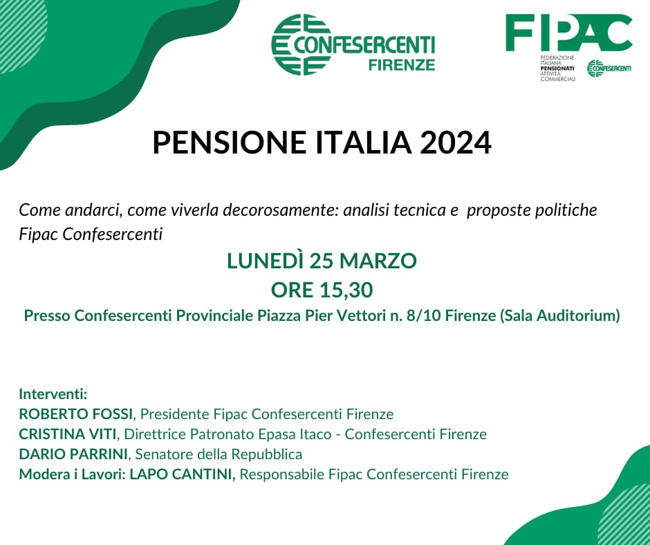 Si terrà lunedì 25 marzo, alle ore 15.30 a Firenze, presso Confesercenti Provinciale in piazza Pier Vettori 8/10 “Pensione Italia 2024, come andarci, come viverla decorosamente: analisi tecnica della Fipac Confesercenti”.