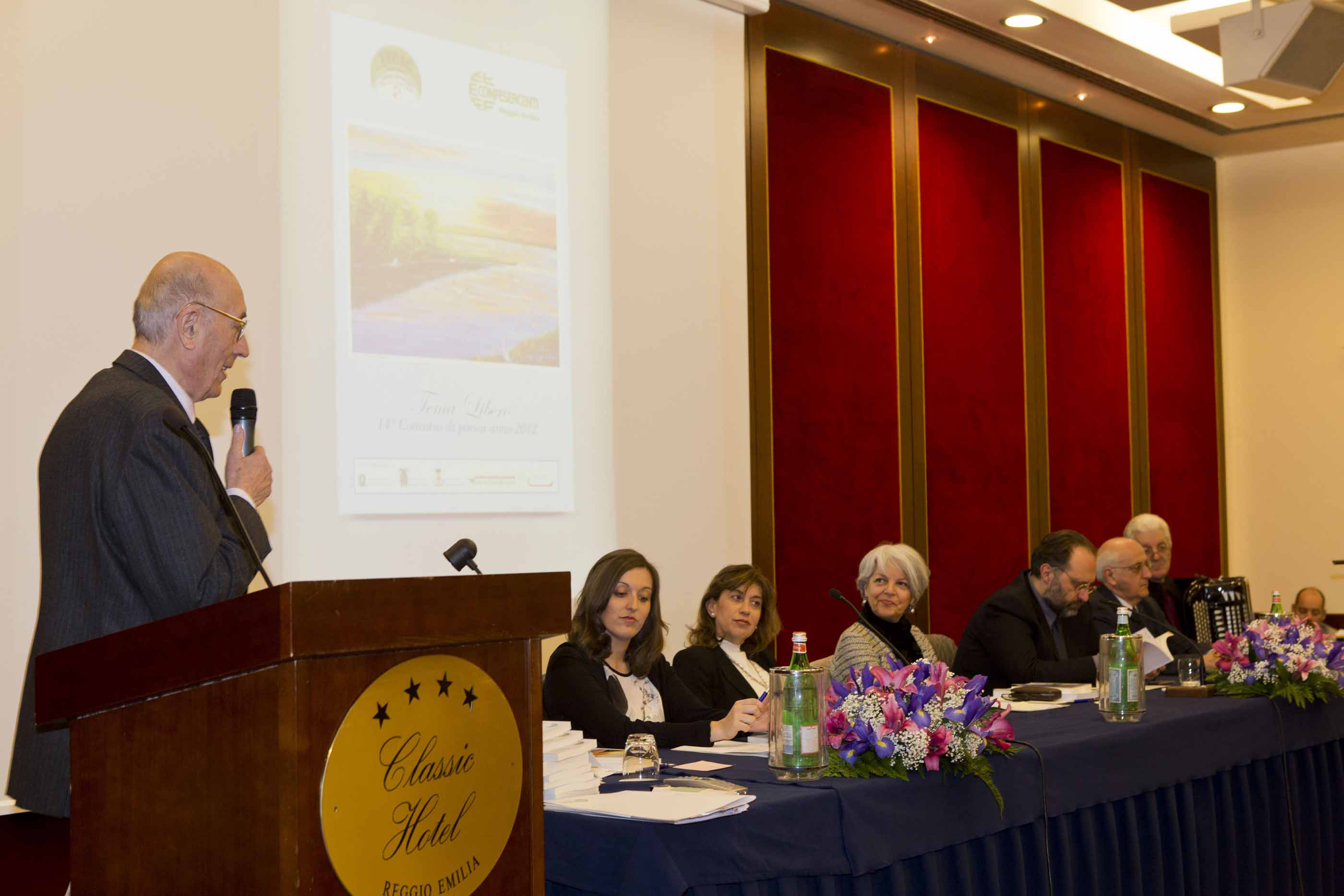 Nel pomeriggio di sabato 23 marzo 2013, al Classic Hotel si è tenuta la cerimonia di premiazione dei vincitori del 14^ Concorso di Poesia promosso dalla Fipac-Confesercenti di Reggio Emilia, con il bando dello scorso anno. Siamo particolarmente orgogliosi di questo concorso perché a livello locale è certamente uno dei più sentiti e vi partecipano adulti di ogni estrazione sociale e tanti ragazzi. Il concorso, infatti, è articolato in due sezioni: quella degli adulti e quella dei giovani da 14 a 20 anni. La commissione che ha vagliato i componimenti era formata da eminenti personalità della società e della cultura reggiana: Arturo Bertoldi, Ildo Cigarini, Liviana Iotti, Francesca Manini, Giuseppe Adriano Rossi, Eugenia Gabriella Gammarrota, quest’ultima invece romana e dirigente del Ministero delle Politiche Sociali. La lettura delle poesie vincitrici è stata eseguita dalla soprano Sandra Gigli che ha alternato la lettura con alcune canzoni accompagnata al pianoforte dal maestro Milo Martani. Quest’anno è intervenuto con la grande professionalità che gli è riconosciuta il maestro fisarmonicista Paolo Gandolfi.